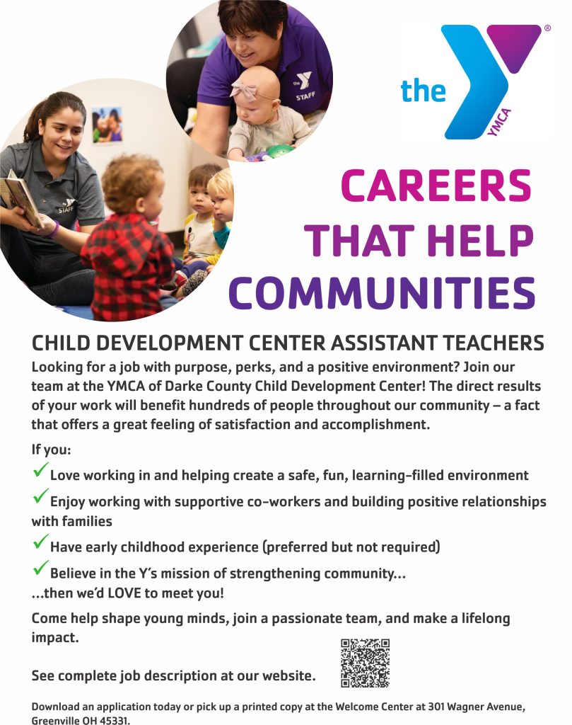 Download an application today or pick up a printed copy at the Welcome Center at the Y, 301 Wagner Avenue, Greenville OH, 45331. Applications for this position can be submitted via email to our Child Development Center Director at childcare@ymcadarkecounty.org. Qualified applicants should apply in person or submit the following electronically: Cover letter, resume, and at least two professional references. Starting pay range is $12.50-$13.50 hourly.